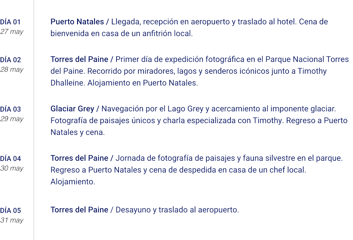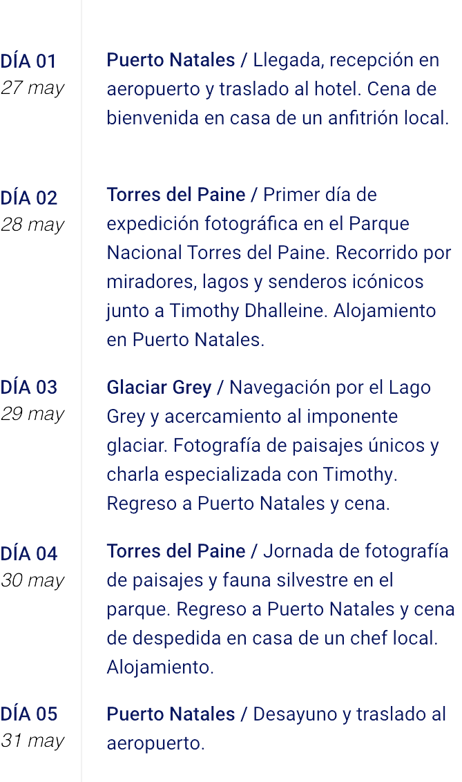 Vive una experiencia única en el fin del mundo, recorriendo algunos de los paisajes más impresionantes de la Patagonia chilena junto a un fotógrafo experto. Durante 5 días y 4 noches, combinarás fotografía, naturaleza y gastronomía local en una expedición diseñada para conectar profundamente con el entorno, aprender técnicas en terreno y capturar imágenes inolvidables.